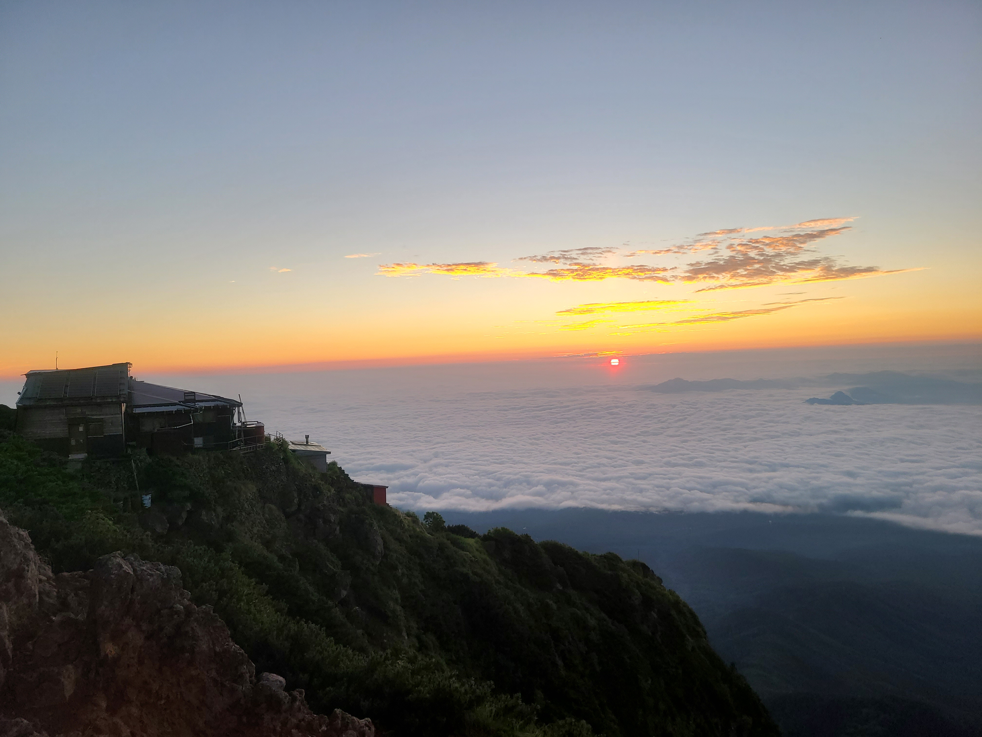 朝3時、なんとか起きれたので、御来光チャンス?間に合うかな?と、まずはトイレへ。すれ違った4人組に「もう赤岳から降りてきたんですか!?」と。ンナワケナイw 後から追いますね〜と声を掛けたら、30分後には5番目で歩く事に。随分なゆったりペースだけど、高山病防止には良かった。ペースメーカーありがとうございました。 山頂に着いたのは4時50分。雲海のおかげも相まって、御来光はまだ!間に合った〜(*≧∇≦)ノ