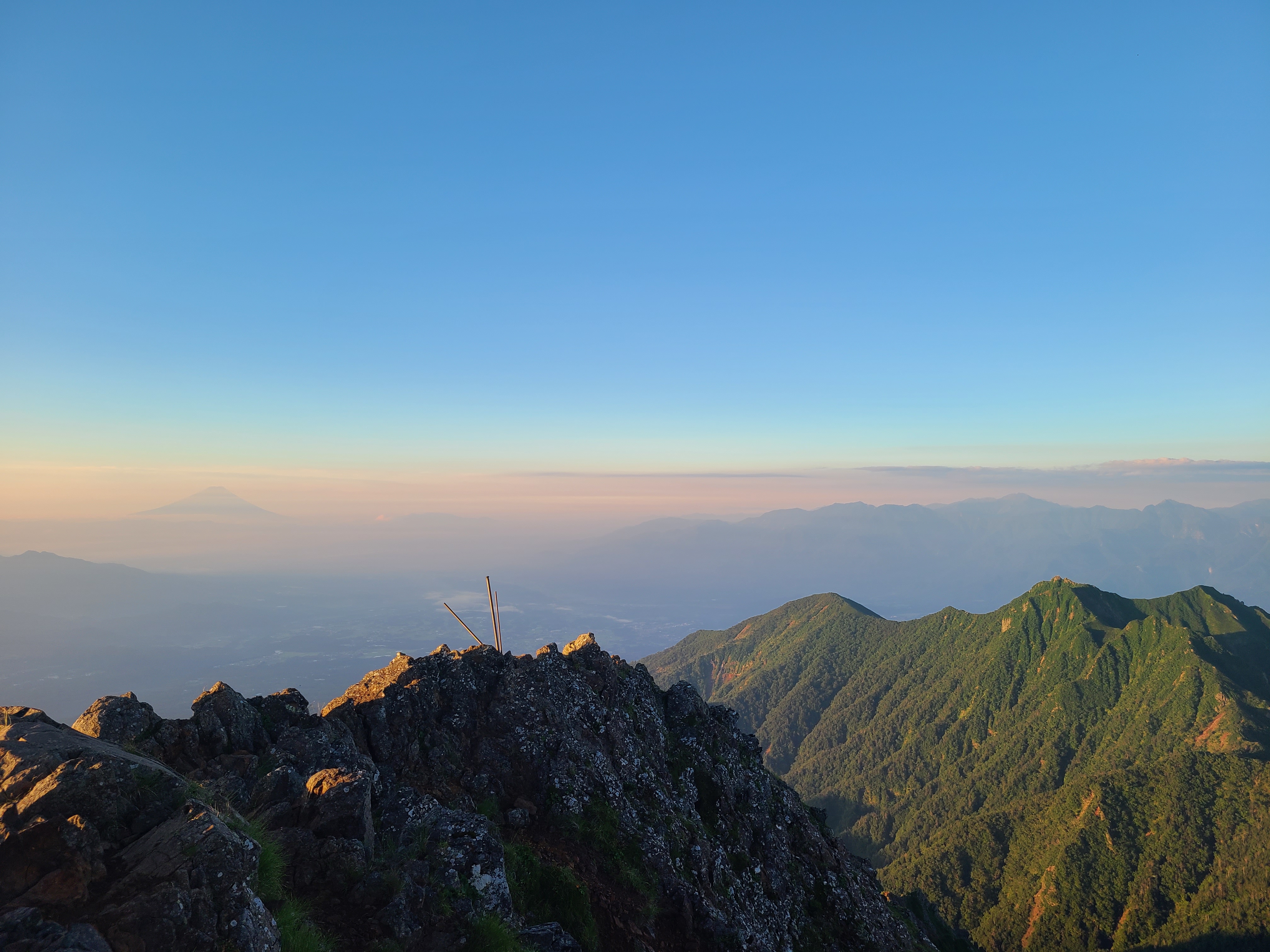 これぞ日本の夜明けじゃ〜!と、坂本さんが脳内で叫ぶw ぐるっと360度、南アルプス、中央アルプス、御嶽、乗鞍、北アルプス、浅間山、上州の山々、そして富士山! 登って善かった〜!
