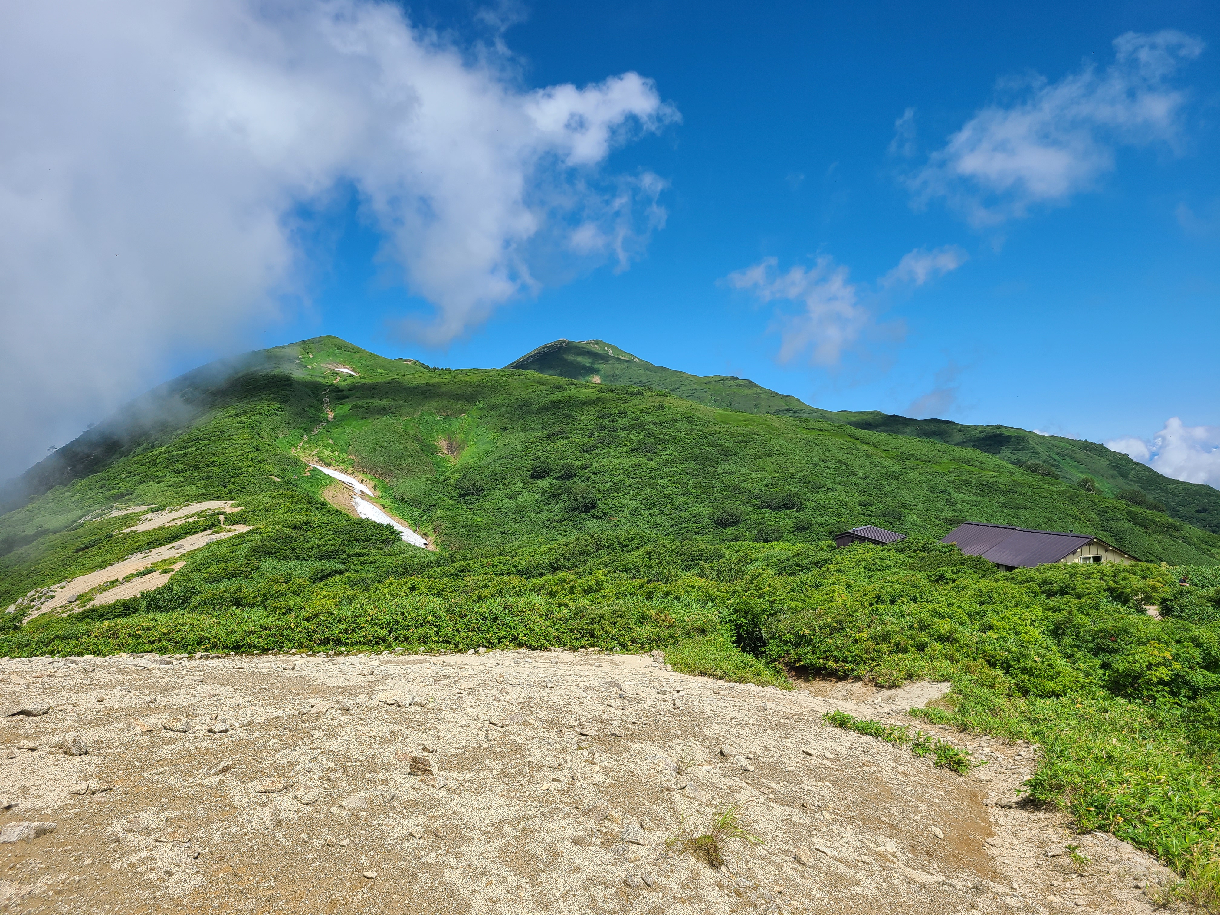 ガスがあまり晴れないのが、飯豊の特徴だそうな。 切合小屋に着いた辺りで、ようやくガスが晴れて来た。 向こうに見えるのが、本山? まだまだ遠いけど、まだ10時前。 よし、本山テン場に向かってレッツゴー!
