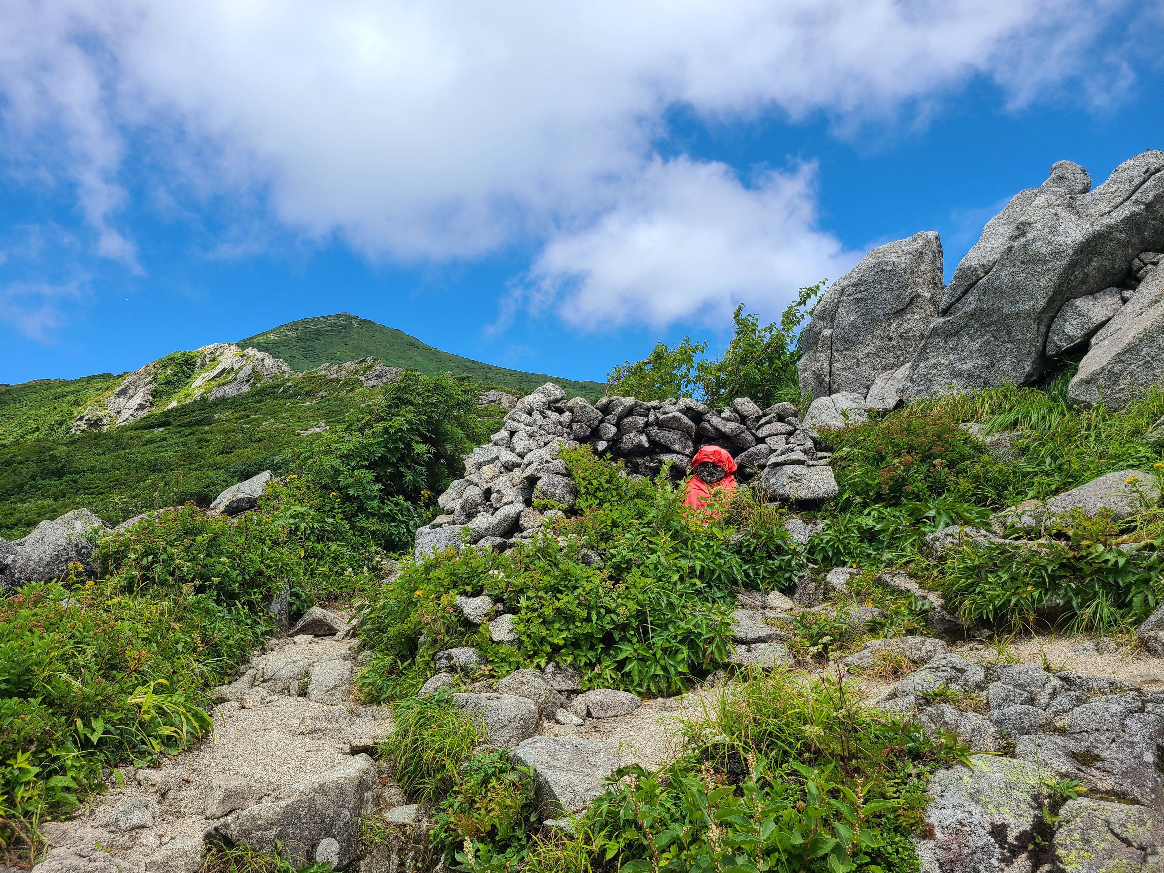 最初の小屋は「三国岳避難小屋」。 仁王立ちしたおじちゃんが迎えます。 粗相をすると怒られるので、要注意! ここから切合小屋までは、所々谷側が切れ落ちてる所があります。なるべく山側寄りに歩くのがベスト。