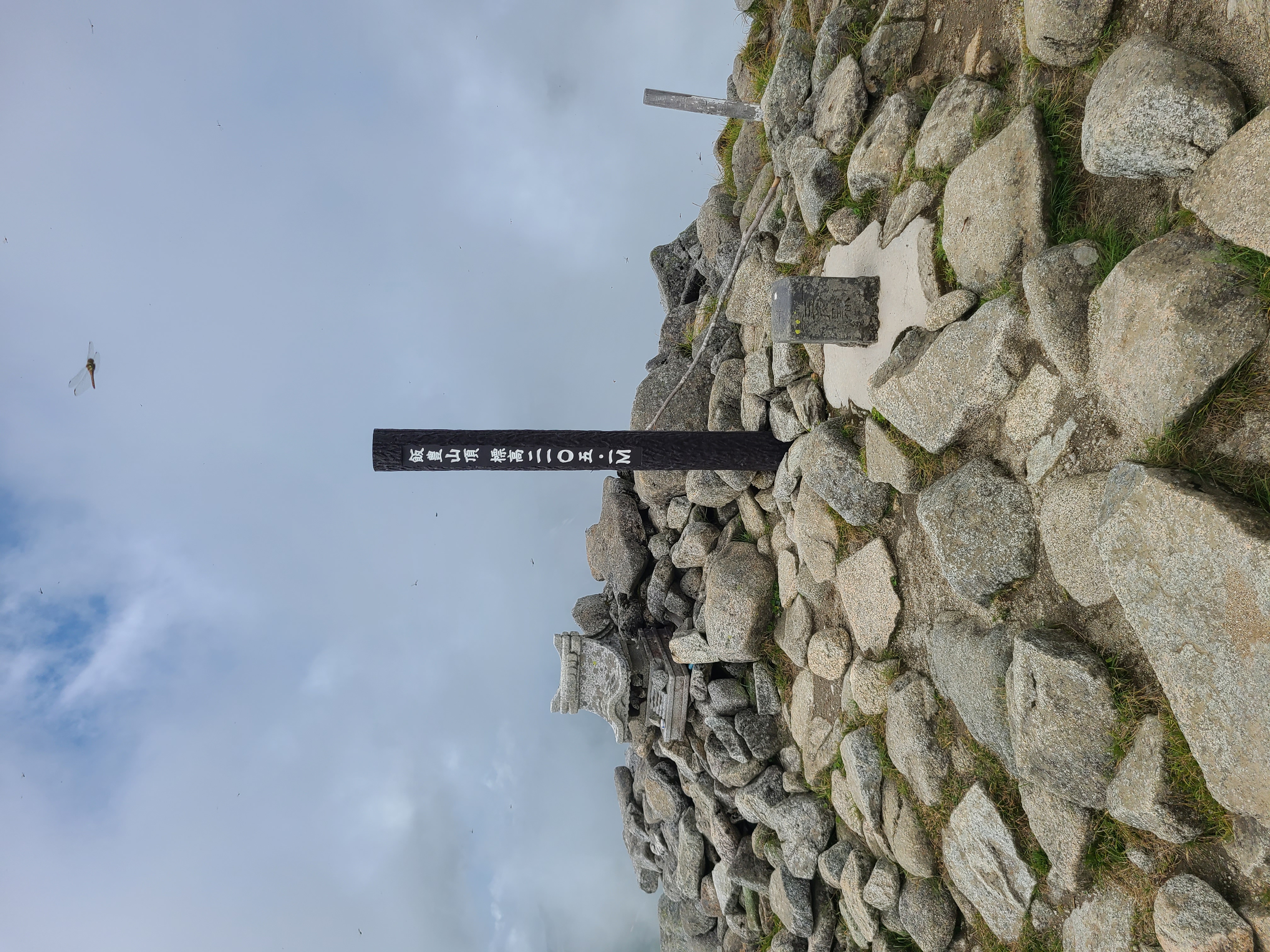 小屋番のオジさんに「景色が見えているうちに山頂に行ってこーい」と言われたので、テント設営前に山頂へ。 その前に小屋横の神社でお参り。 なかなかに大きいお社です。 当時は気付かなかったけど、鳥居に標識付けてエエんやろうかw